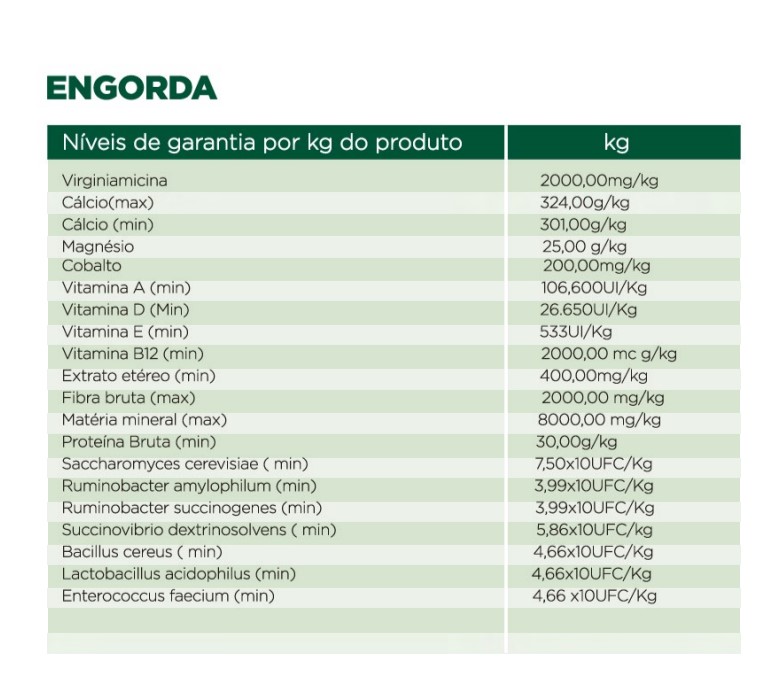 O aliado ideal para maximizar o ganho de peso e qualidade da carcaça. Indicado para confinamento e terminação, promove o acúmulo eficiente de carne e gordura. Contém Virginamicina, que potencializa a quebra de grãos no rúmen e melhora significativamente a absorção de nutrientes.